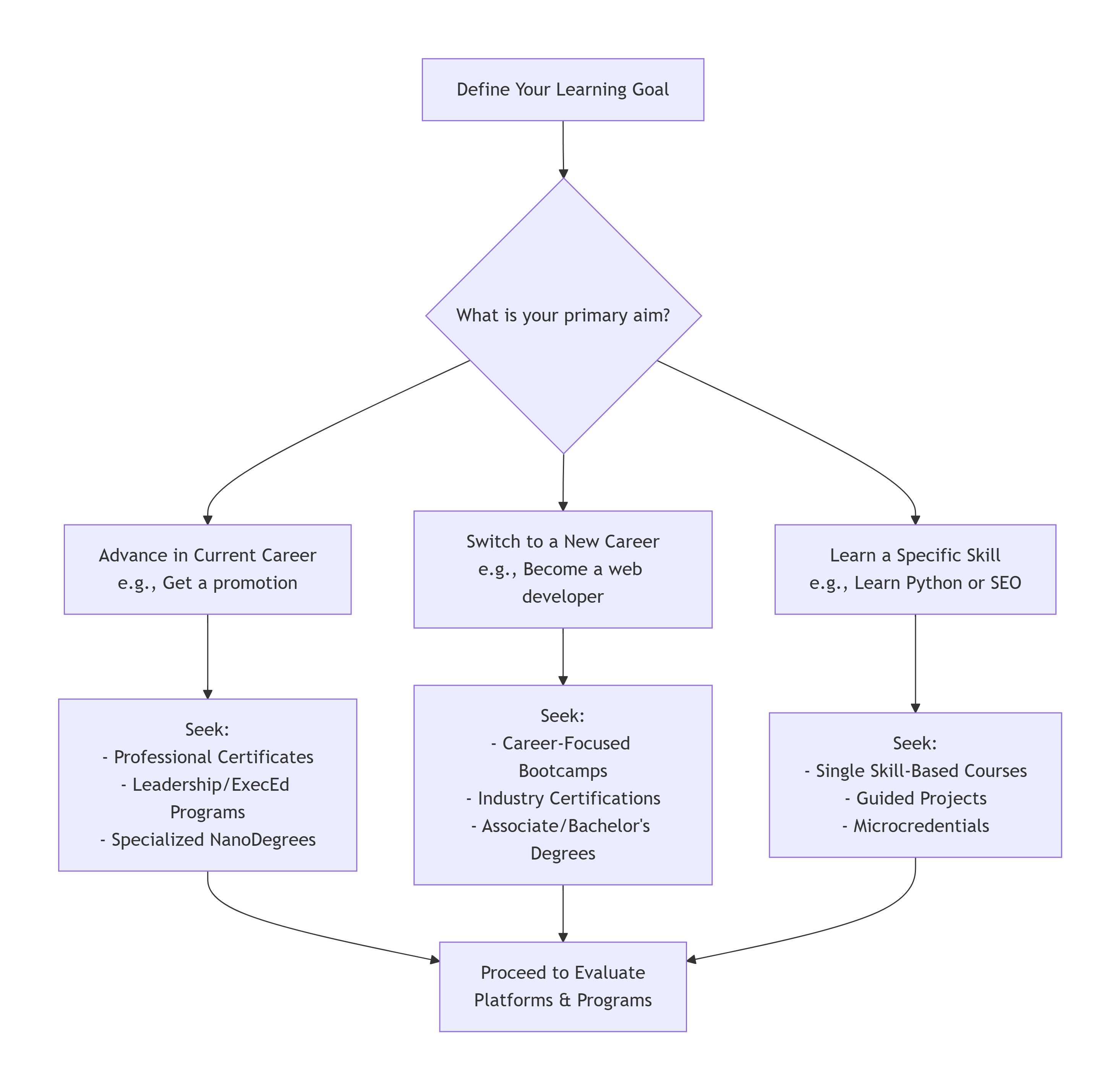 Your search must start with your objective. The right course for "upskilling for a promotion" is different from one for a complete "career pivot." Use this flowchart to clarify your starting point: